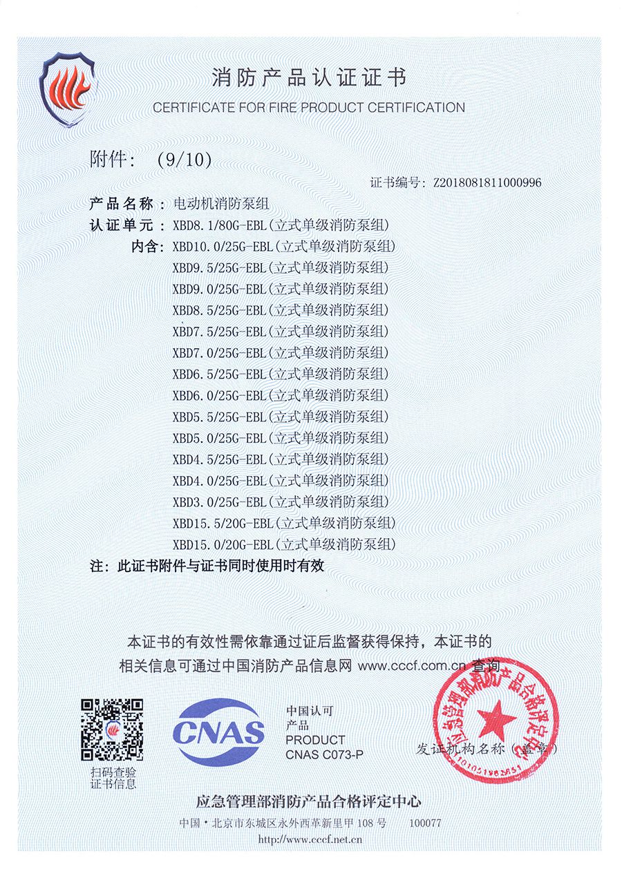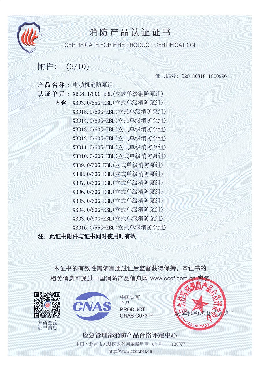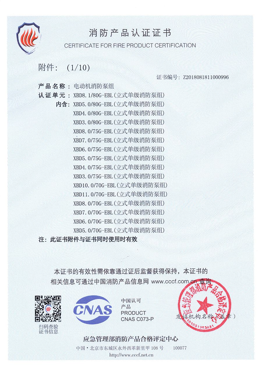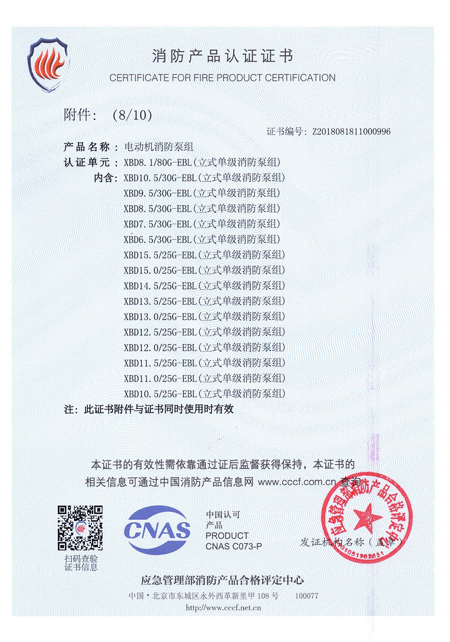立式單級EBL-消防產(chǎn)品認證證書(shū)