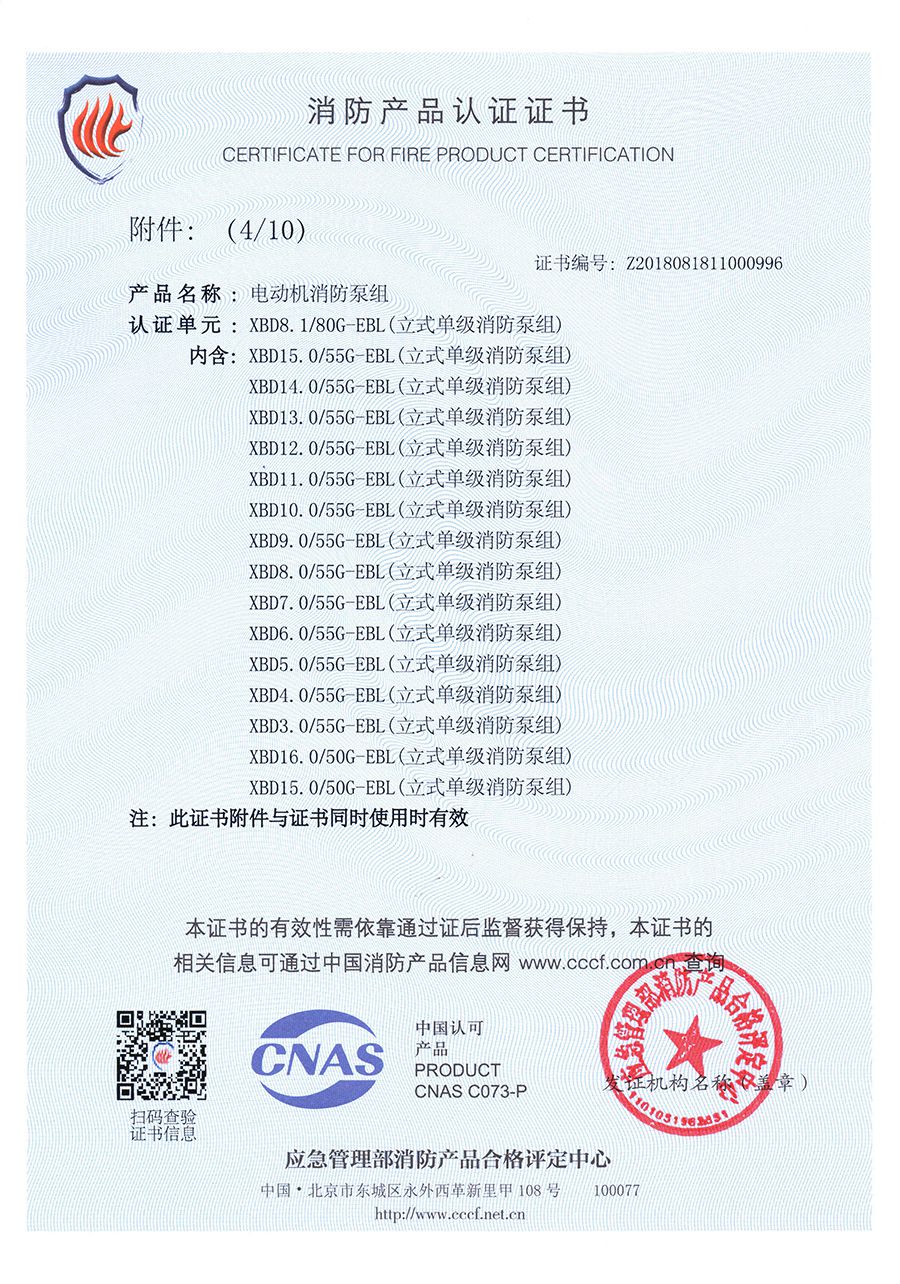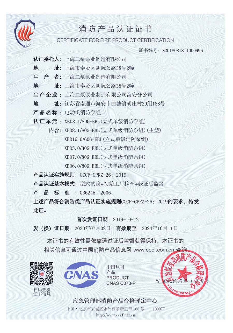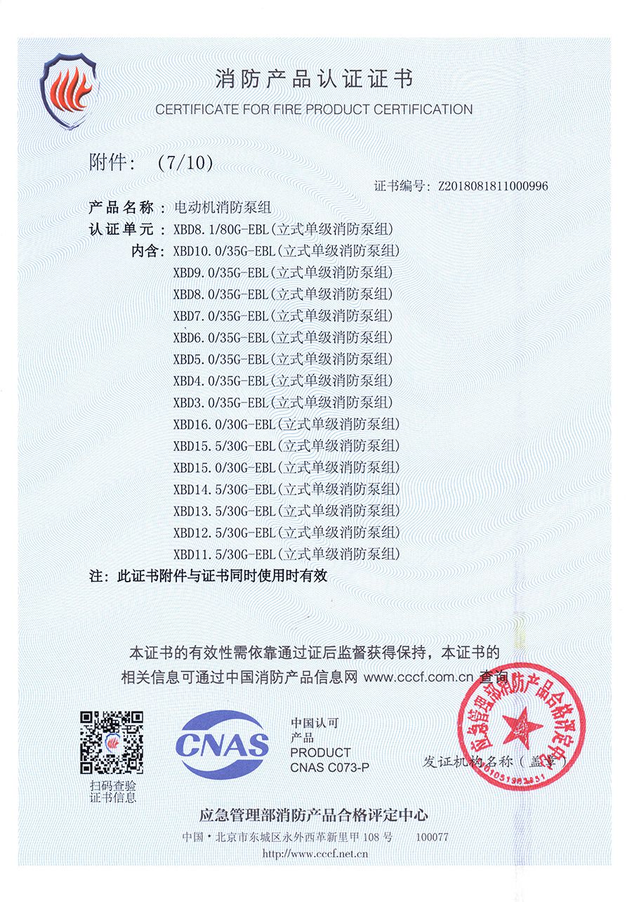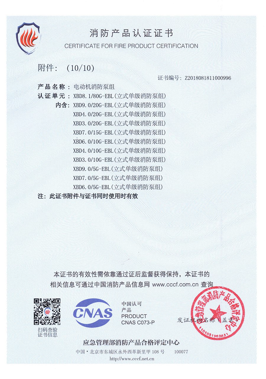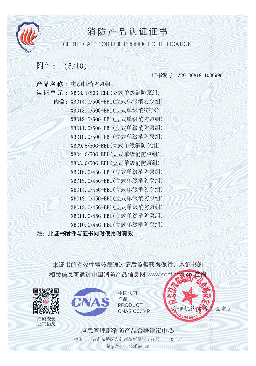 立式單級EBL-消防產(chǎn)品認證證書(shū)