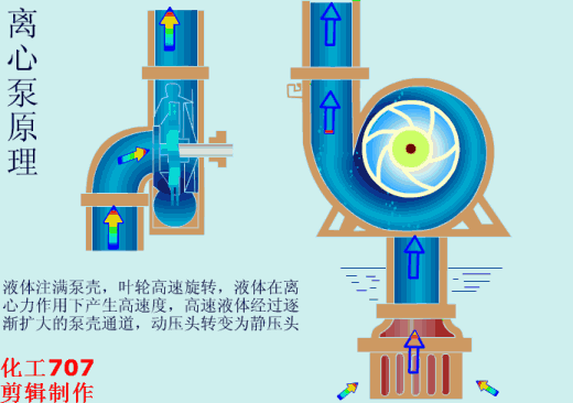 液體注滿(mǎn)泵殼,葉輪高速旋轉,液體在離心力作用下產(chǎn)生高速度,高速液體經(jīng)過(guò)逐漸擴大的泵殼通道,動(dòng)壓頭轉變?yōu)殪o壓頭